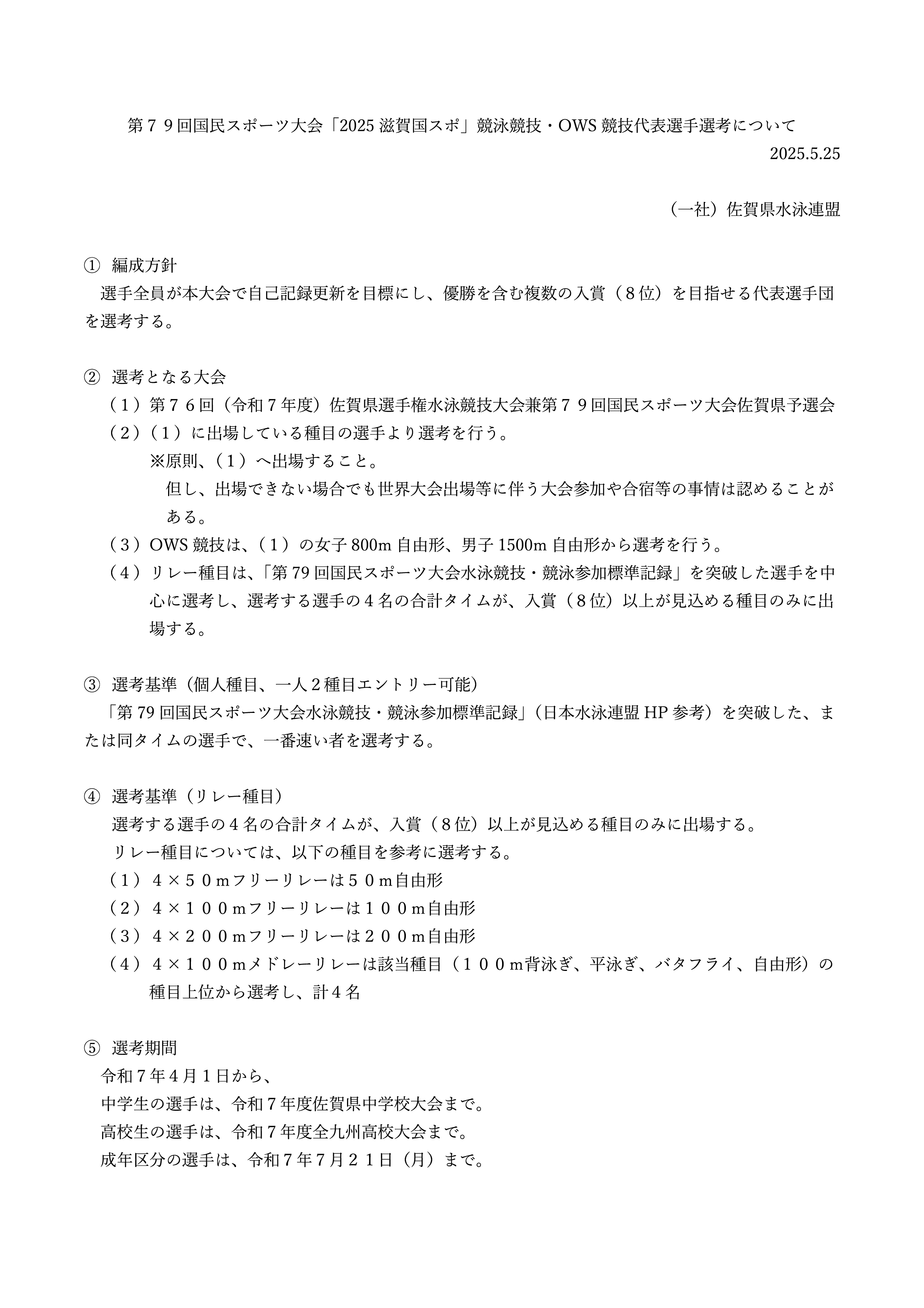 第79回国民スポーツ大会「2025 滋賀国スポ」競泳競技・OWS 競技代表選手選考について