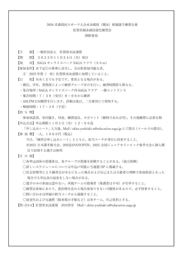2025年10月20日 / 最終更新日時 : 2025年10月20日 SWIMSAGA お知らせ 2026青森 国民スポーツ大会 水泳競技(競泳) 候補選手練習会 兼 佐賀県競泳競技強化練習会 ○ 開催要項(PDF) ○ 参加者承諾書(PDF) ○ 申込シート(Excel)