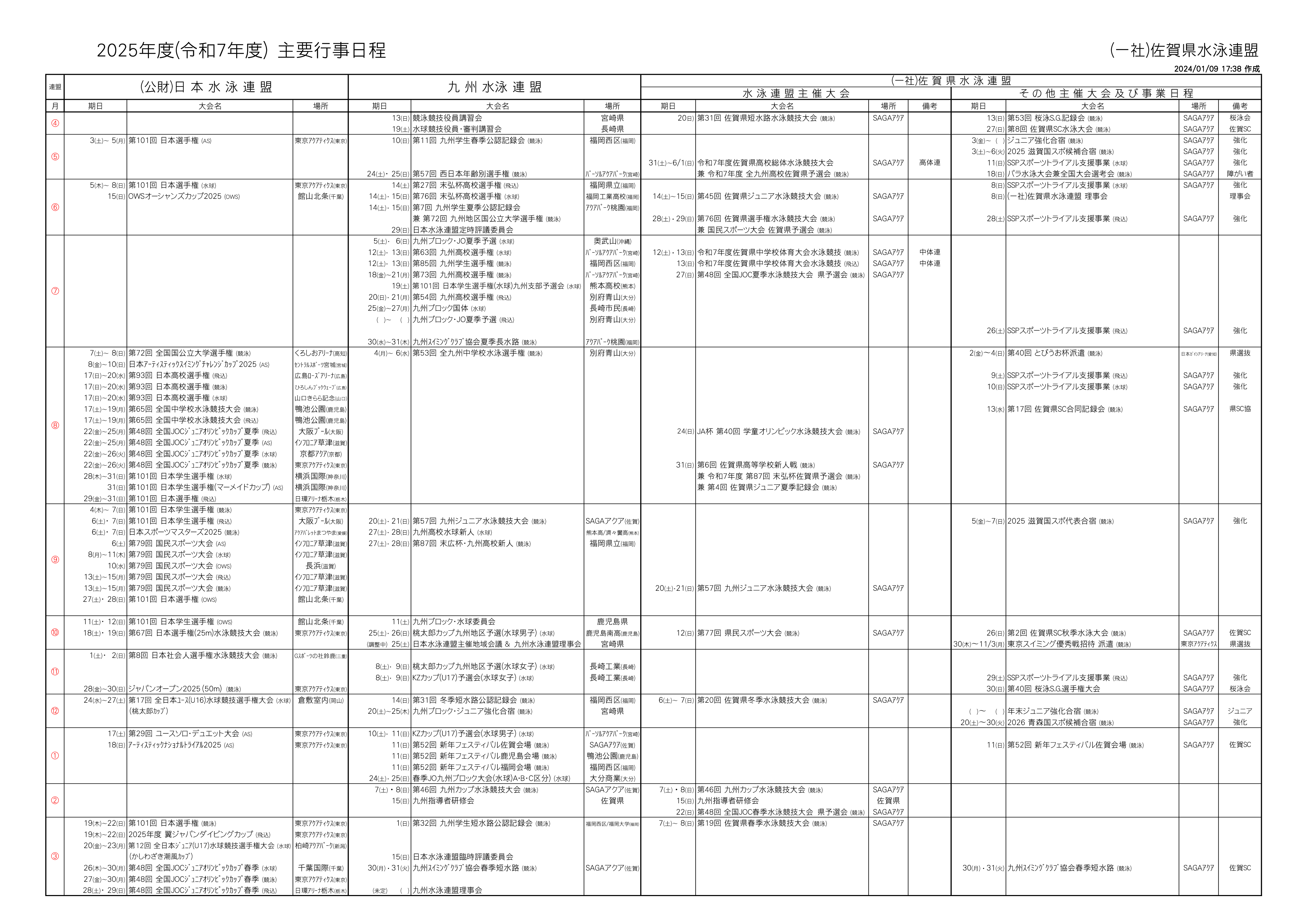 | 12/06~07 | 第20回 佐賀県冬季水泳競技大会 | SAGAアクア(25m) | 11/17 |