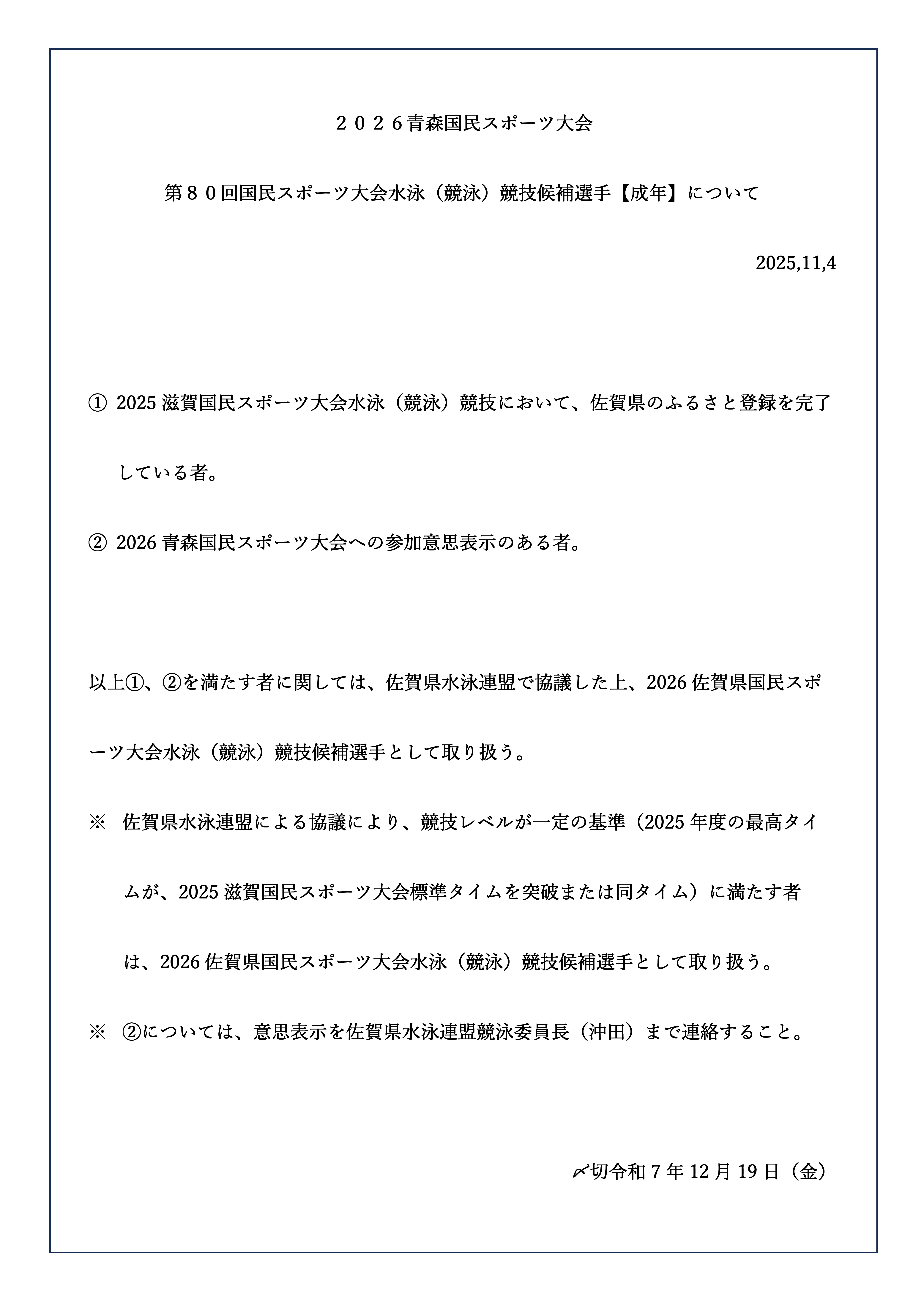 2026青森国民スポーツ大会 第80回国民スポーツ大会水泳(競泳)競技候補選手【成年】について