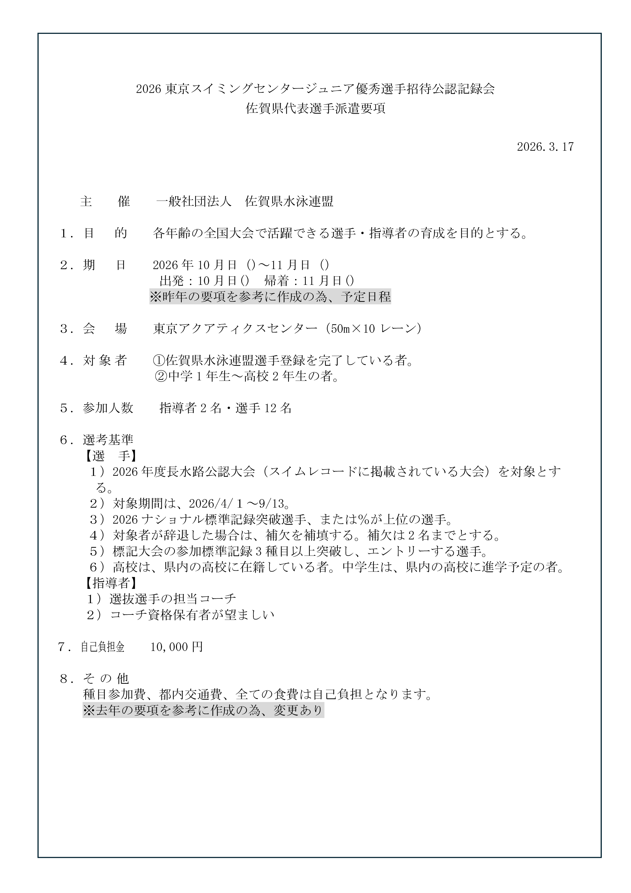 4. 2026東京スイミングセンタージュニア優秀選手招待公認記録会 佐賀県代表選手派遣要項