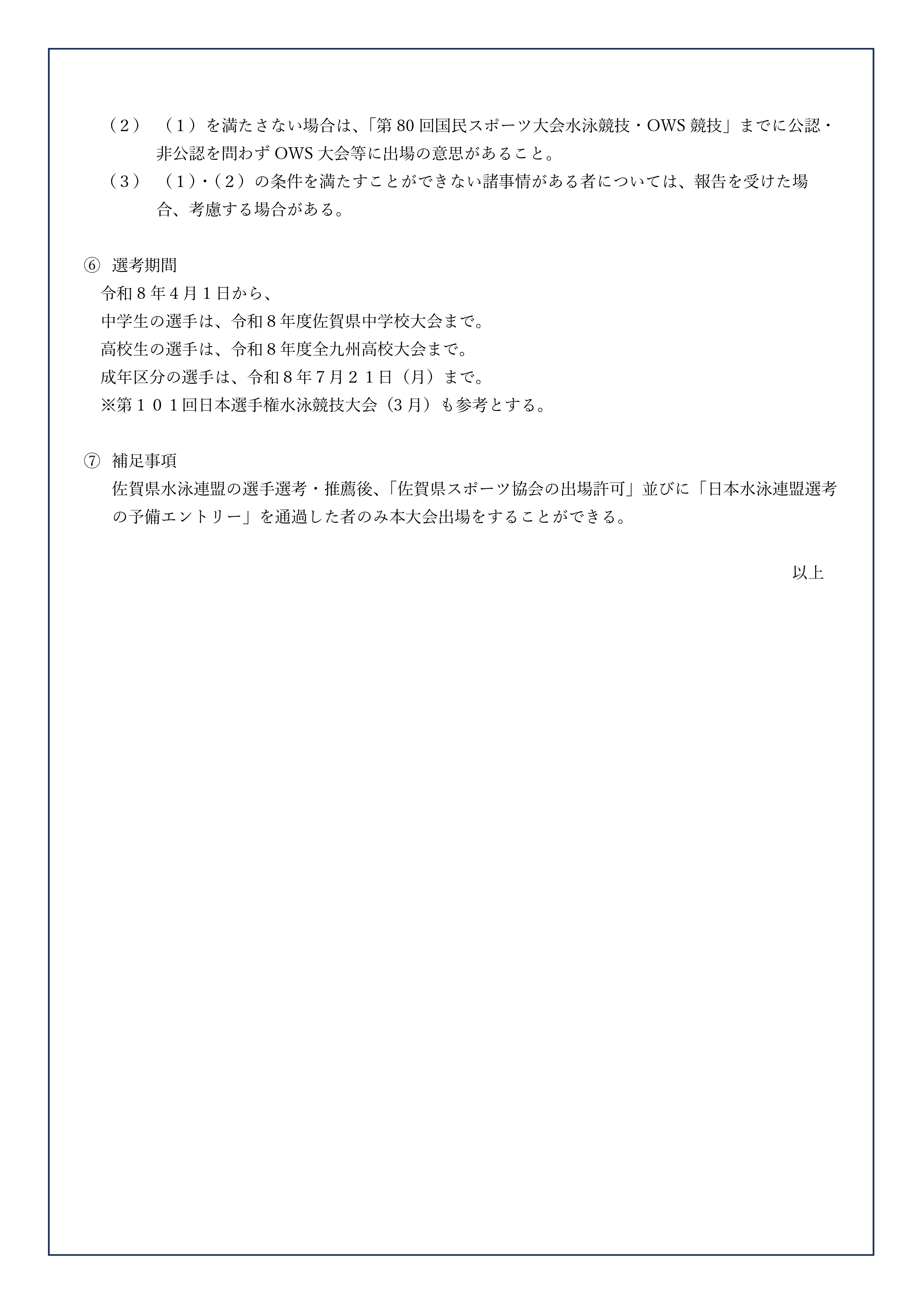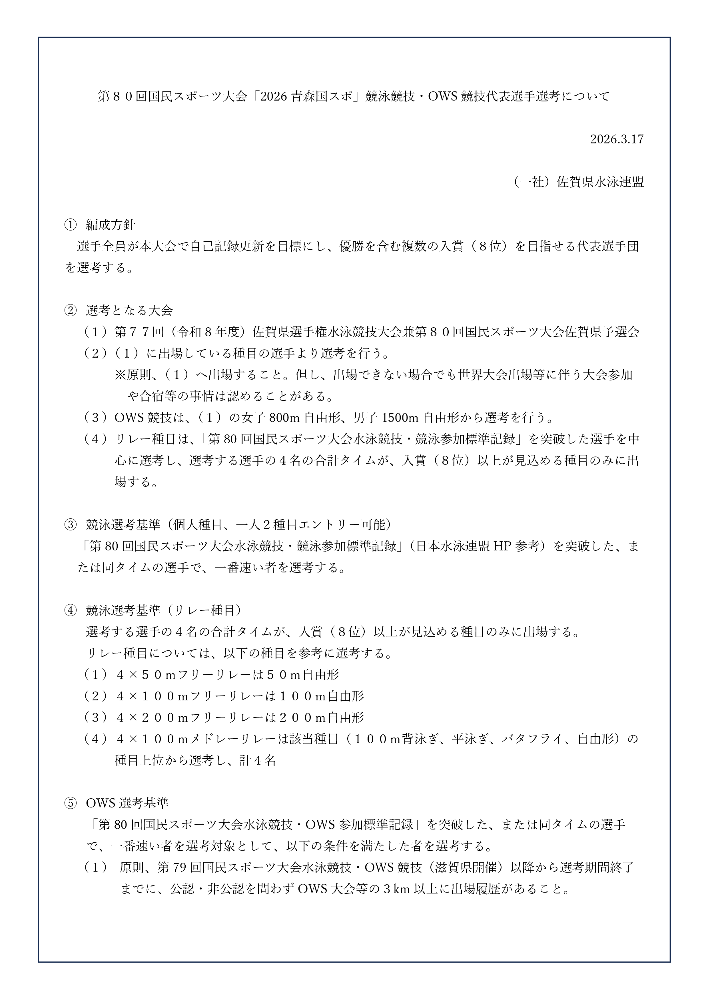 4. 第80回国民スポーツ大会「2026青森国スポ」競泳競技・OWS競技代表選手選考について