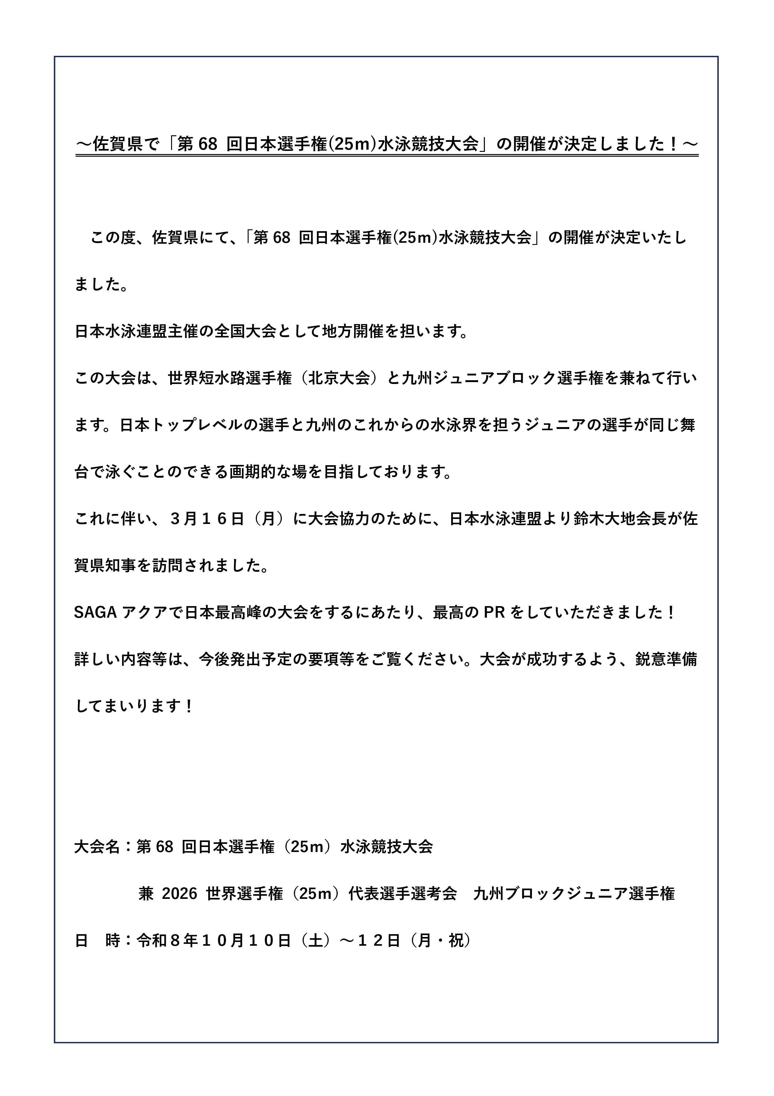 4. ~佐賀県で「第68 回日本選手権(25m)水泳競技大会」の開催が決定しました!~